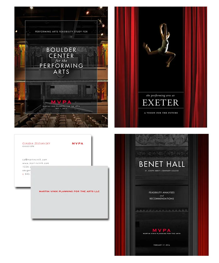 Martin Vinik Planning for the Arts (MVPA) provides design services to owners, architects and agencies charged with developing performing arts spaces around the world. Brooklyn Twinkle has designed the covers for the studies published by MVPA for their clients, as well as MVPA's business cards.